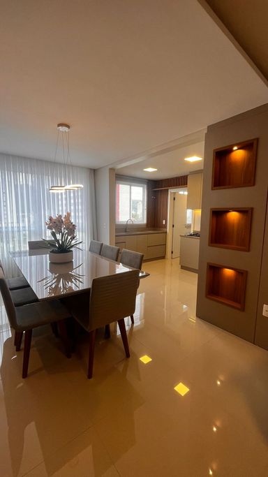 Características: suíte + 02 quartos, banheiro social, lavabo, sala de estar e jantar integradas, cozinha semi-integrada com balcão, sacada separada com churrasqueira a carvão e fechamento em reiki, área de serviço e 02 vagas de garagem. Permanece os móveis sob medida. Vista para o pôr-do-sol no living e na sacada. Área privativa: 116,58m². Condomínio: Hall de entrada mobiliado e decorado, 02 elevadores, salão de festas equipado e playground. São apenas 02 apartamentos por andar. Valor: R$ 990.000,00.