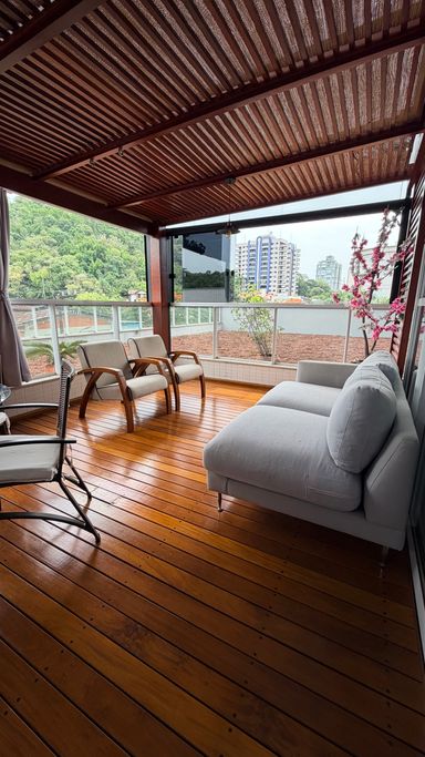 Dependências: Suíte + 01 dormitório, banheiro social, sala de estar/jantar, cozinha, área de serviço, vaga de garagem para 02 carros com depósito. Amplo terraço com tamanho em torno de 140 m², teve parte dele já coberta, onde está instalado um espaço para escritório com poltrona e sofá integrada à área privativa do apartamento. Área privativa apartamento: 75,93 m² Área privativa incluindo parte coberta do terraço: 115 m² Apartamento completo: Ficam todos os móveis soltos, sob medida e eletrodomésticos.
