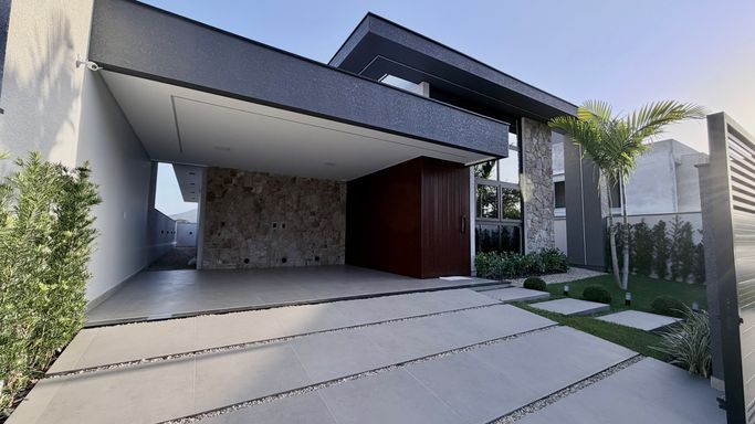 Dependências: 03 suítes com persianas automatizadas, banheiro social, amplo living integrado, área gourmet com churrasqueira, piscina e 02 vagas de garagem. Finamente acabada com pé direito alto. Localizada em loteamento alto padrão de casas novas. Valor: R$ 1.725.000,00.
