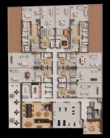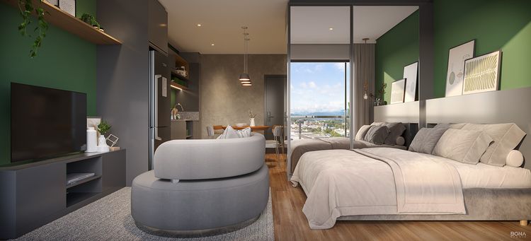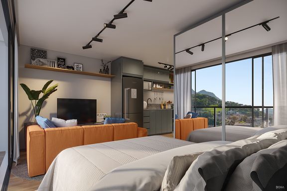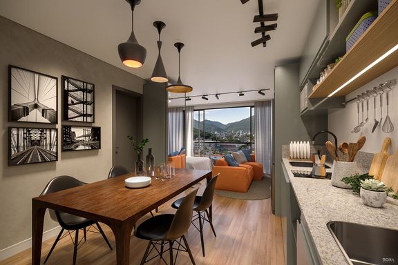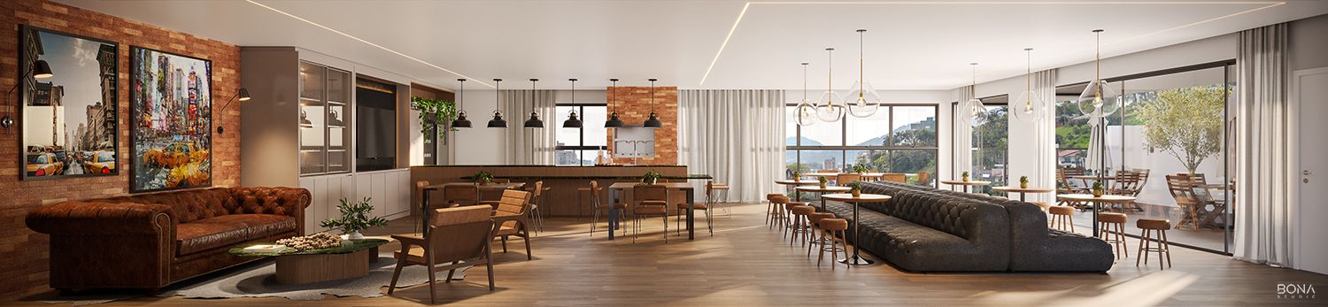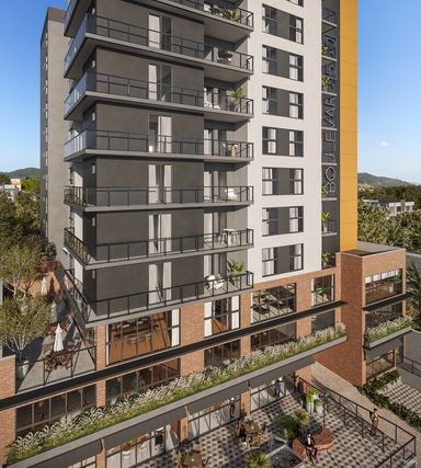 Condomínio com salão de festas, academia, coworking e outras facilidades para os moradores como loja de conveniência e lavanderia.