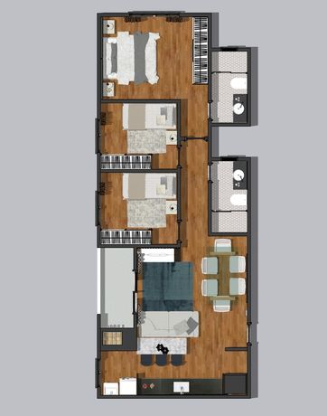 Características: Suíte + 02 dormitórios, banheiro social, sala de estar/jantar, cozinha, sacada com churrasqueira, área de serviço e vaga de garagem. Plantas com área privativa de 73,20 à 83,22m².