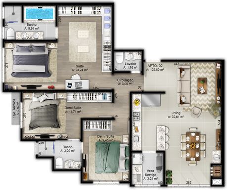 TIPO 02- Suíte + 02 demi suítes, lavabo, living integrado com cozinha, sala estar/jantar, churrasqueira) área de serviço e vaga de garagem em linha/gaveta.