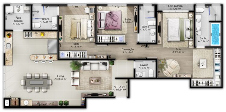 Características: TIPO 01- 03 Suítes, lavabo, living integrado com cozinha, sala estar/jantar, churrasqueira) área de serviço e 02 vagas de garagem.