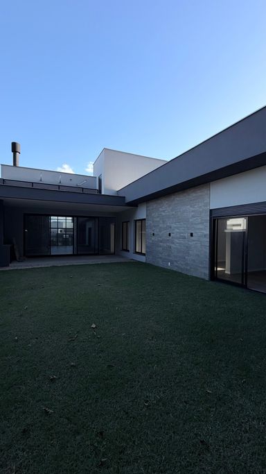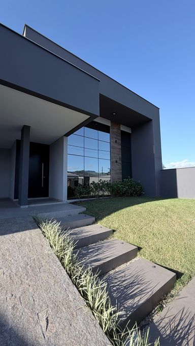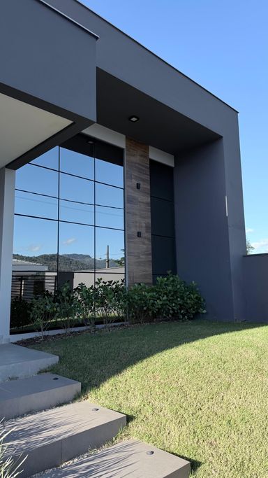 Dependências: Suíte com um closet super espaçoso + 2 dormitórios, cozinha, sala de estar/jantar, banheiro social, lavabo, escritório, área de serviços, espaço para piscina, janelas grandes no corredor dos quartos para que a natureza esteja sempre presente e 02 vagas de garagem.