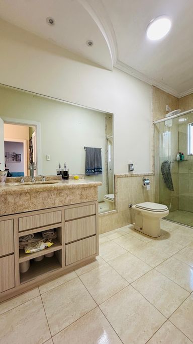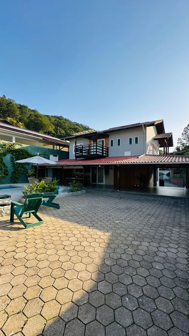 Piso inferior composto por hall de entrada, lavabo, sala de estar, sala de jantar, cozinha, área de festas, piscina, lareira externa e vaga de garagem para 04 carros.