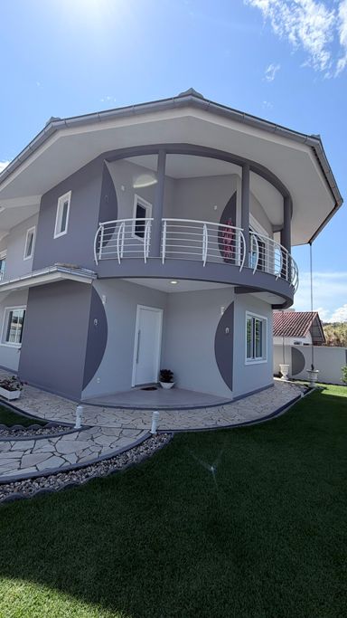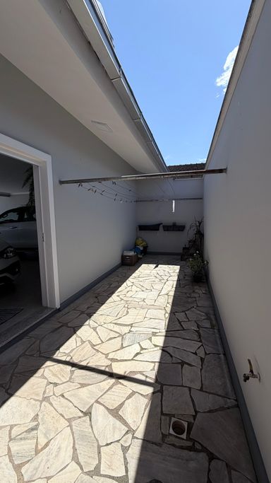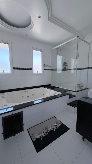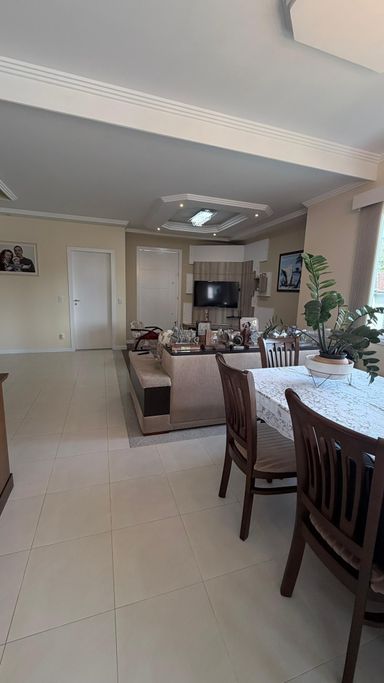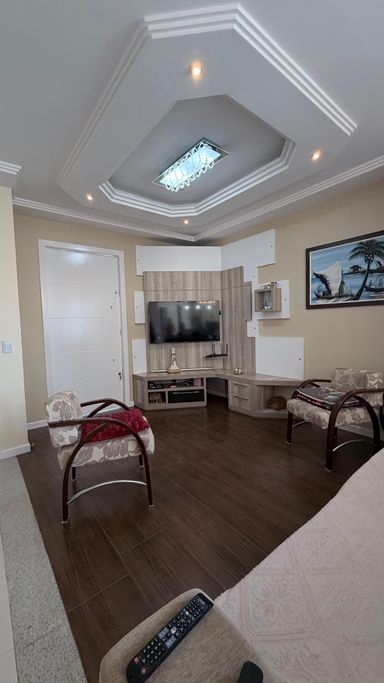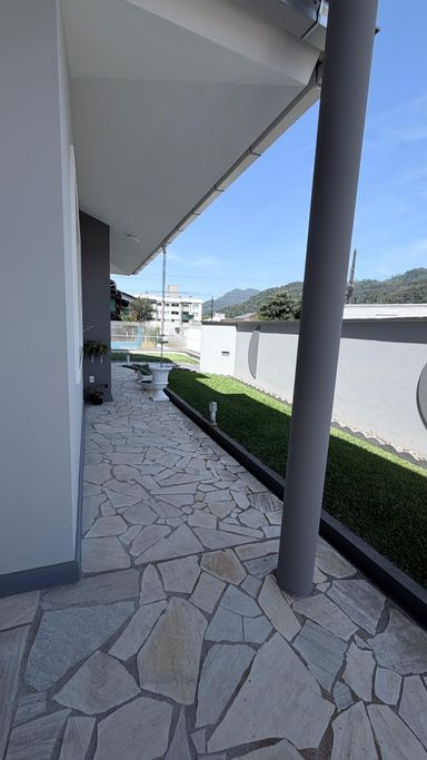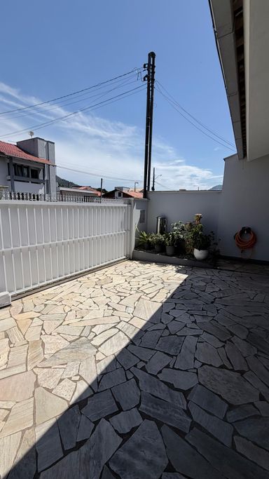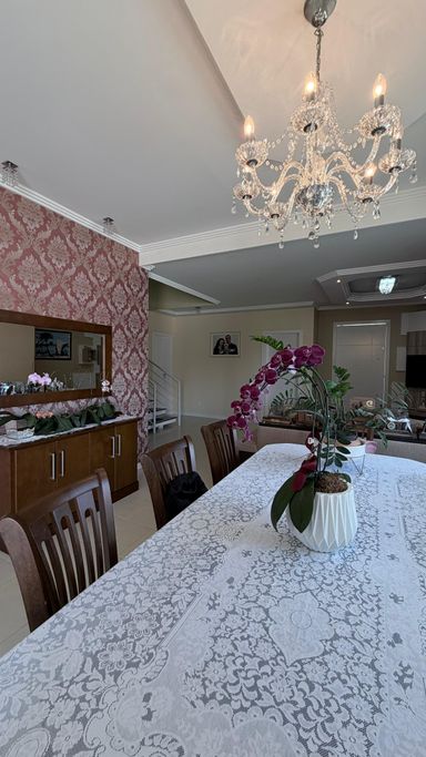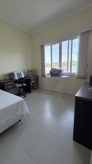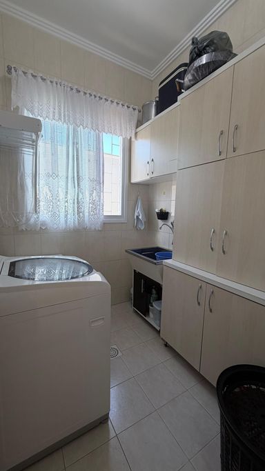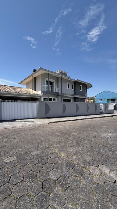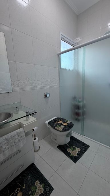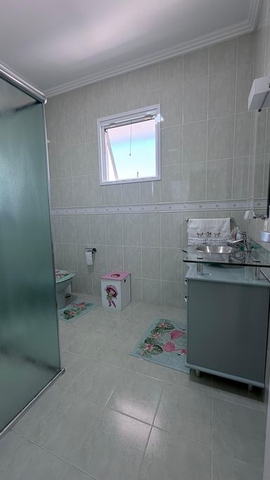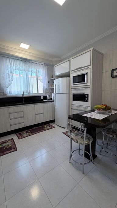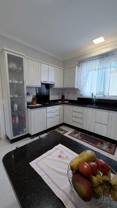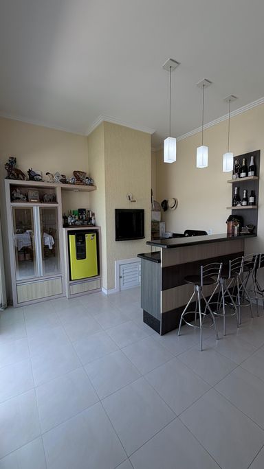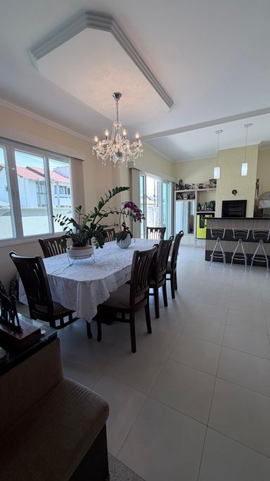 Piso inferior composto por sala de jantar/estar, cozinha, área de serviço, banheiro social, quarto, ampla área de festas com churrasqueira e 03 vagas de garagem coberta.