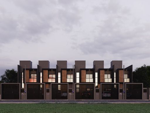 Piso inferior composto por sala de estar/jantar, cozinha, lavabo, área de serviços, área externa com churrasqueira, quintal com área de 32m², piscina e 02 vagas de garagem.