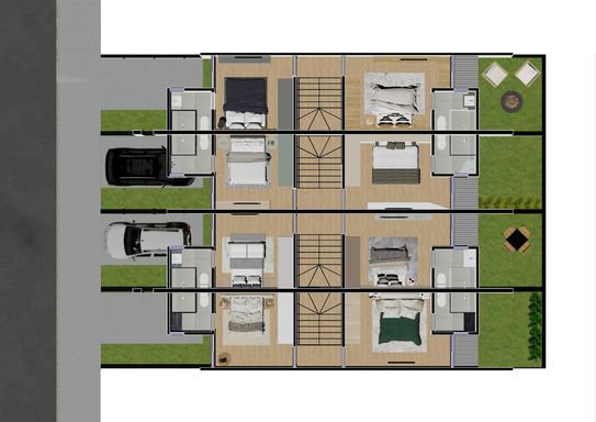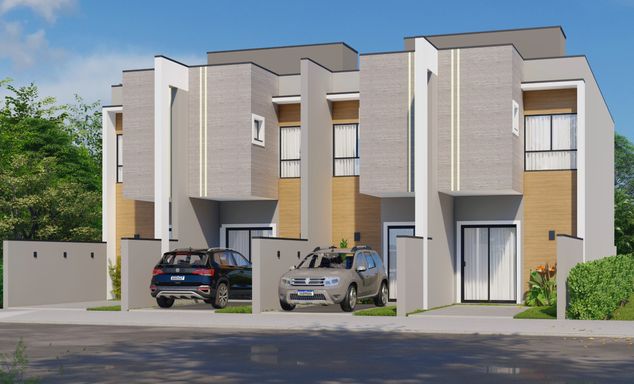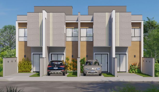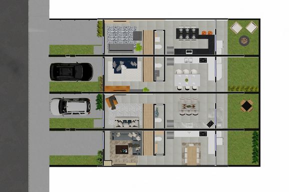 Piso inferior composto por sala de estar, sala de jantar/cozinha, lavabo, área externa e vaga de garagem.