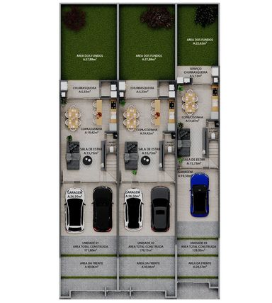 Piso inferior composto por sala de jantar/estar, cozinha, área serviços, lavabo, churrasqueira e 02 vagas de garagem.