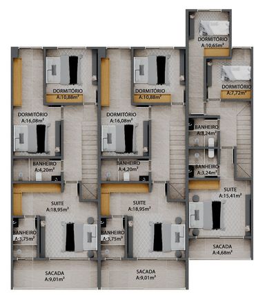 Dependências: Piso superior composto por suíte + 02 dormitórios e banheiro social.