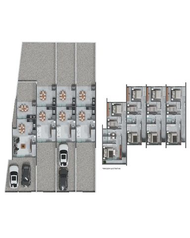 Piso inferior composto por sala de jantar/estar, cozinha, área de serviços, lavabo e 02 vagas de garagem.
