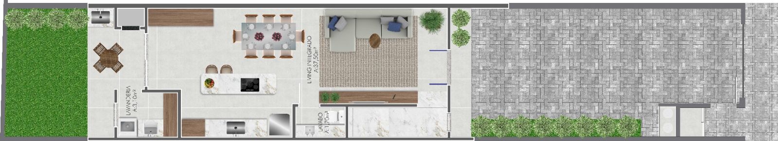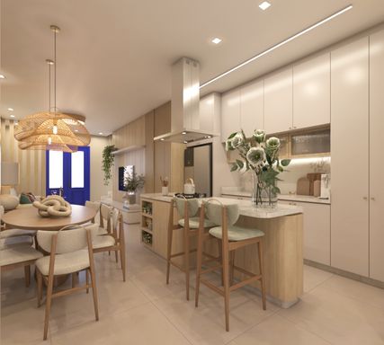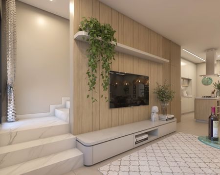 Piso inferior composto por living integrando sala de TV/ jantar e cozinha, lavabo, área de serviço, área gourmet integrada ao quintal e 02 vagas de garagem.