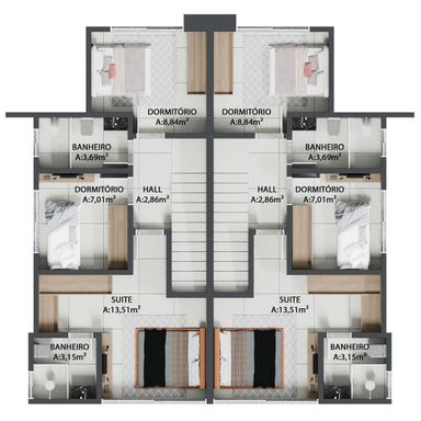 Dependências: Piso superior composto por suíte + 02 dormitórios e banheiro social.
