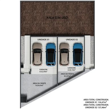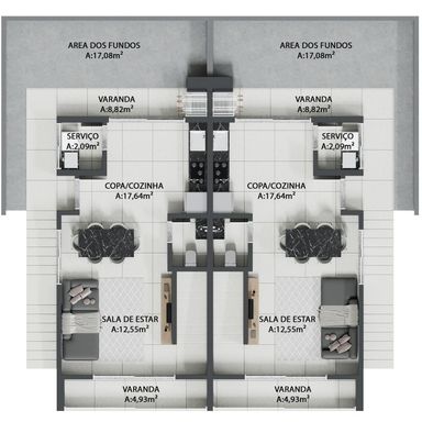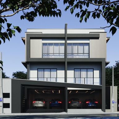 Piso inferior composto por sala de jantar/estar, cozinha, área de serviço, lavabo, área dos fundos com churrasqueira e 02 vagas de garagem.