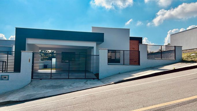 Piso inferior composto por cozinha, sala de jantar/estar, lavabo, área de serviço, churrasqueira, amplo espaço nos fundos e 02 vagas de garagem.