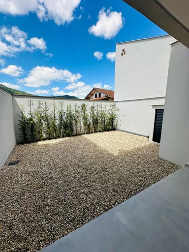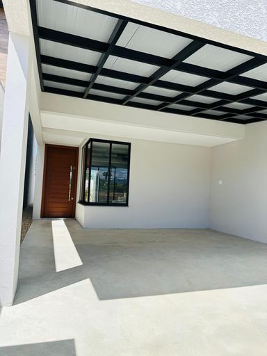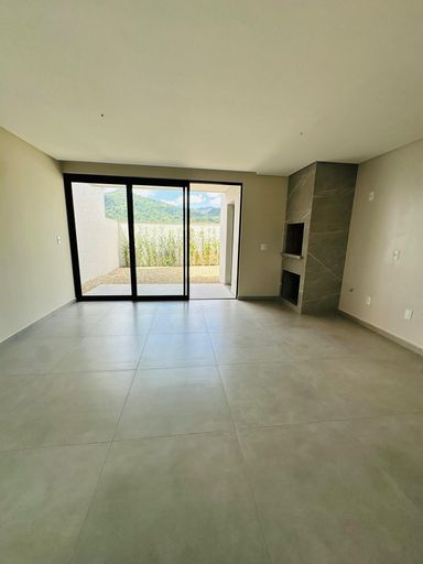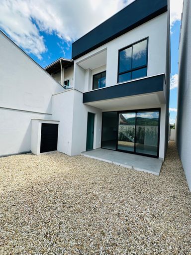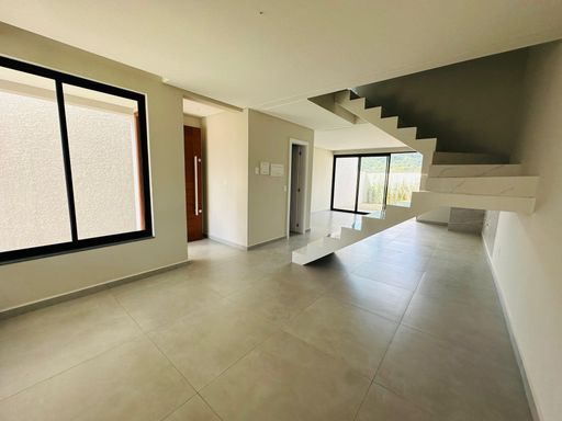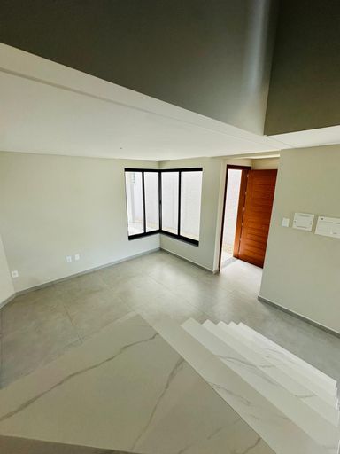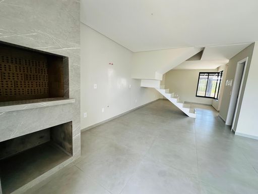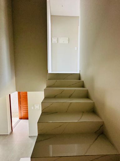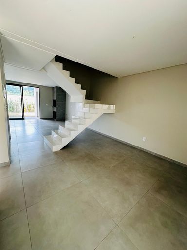 Piso inferior composto por sala de jantar/estar, cozinha, área de serviço, lavabo e 02 vagas de garagem.